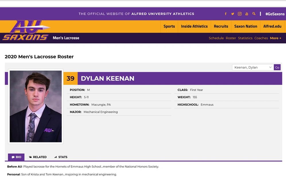 Please join me in congratulating Dylan Keenan, Class of 2019 Emmaus High School, for being the first Stars & Stripes Lacrosse Alumni to officially commit to play lacrosse in college. Dylan will be playing for the Alfred University Saxons in the Division III Empire 8 Conference in upstate New York. While Dylan started playing lacrosse a few years later than his younger brother, Jack (who was already a Stars & Stripes player), he knew he had to work harder to catch up. Dylan’s work ethic and positive attitude allowed him to overcome his late start and positions him for success in both college and life. When we created the purpose statement for Stars & Stripes Lacrosse, “teaching boys how to become men by playing with a ball and a stick”, Dylan was the type of man we envisioned as the end game. We know Tom, Krista, and Jack are very proud of Dylan’s accomplishments to date and we look forward to joining them keep tabs on his collegiate success as well. Go “storm the hill”, Dylan! The world awaits.